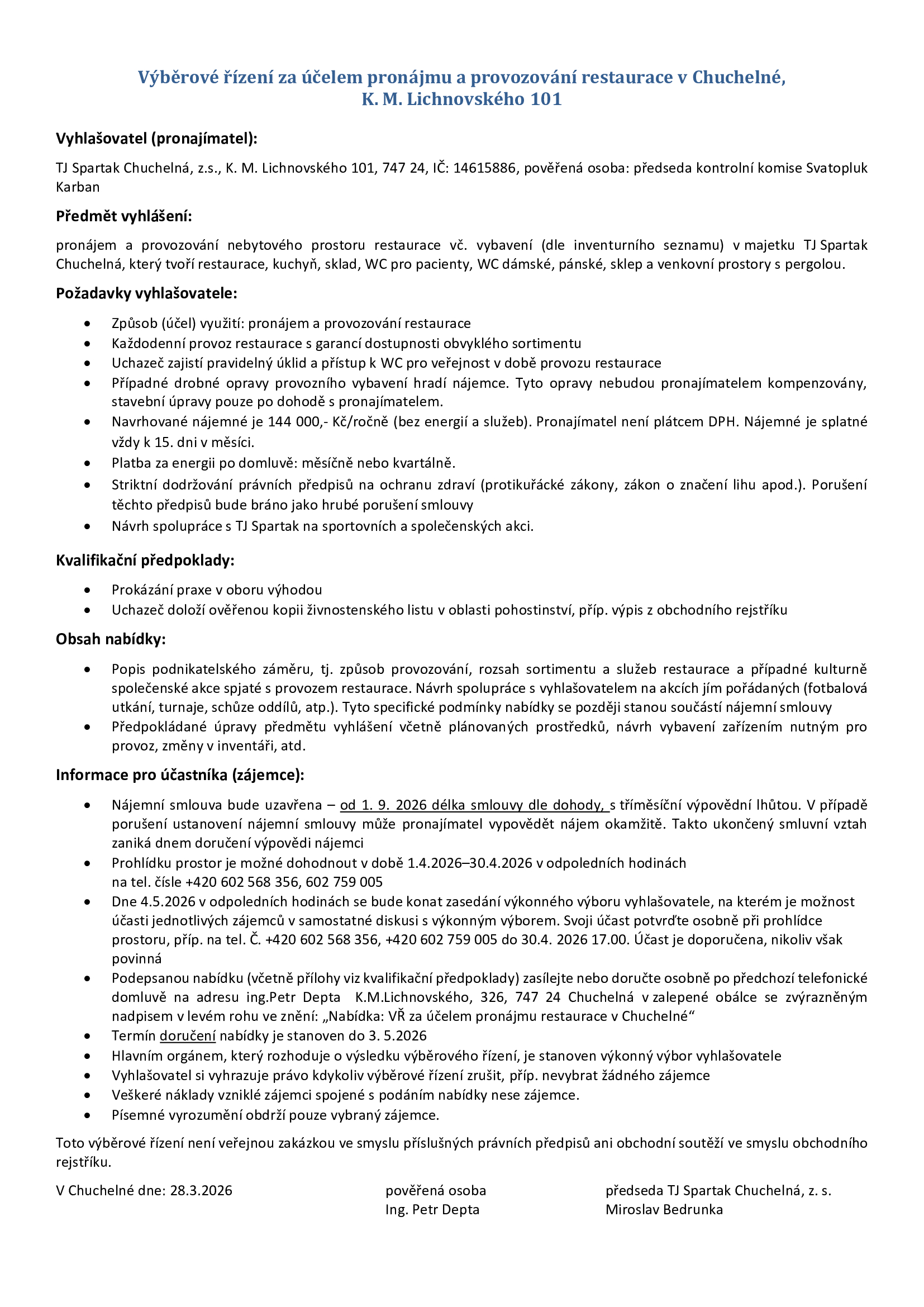 Výběrové řízení – pronájem restaurace Spartak